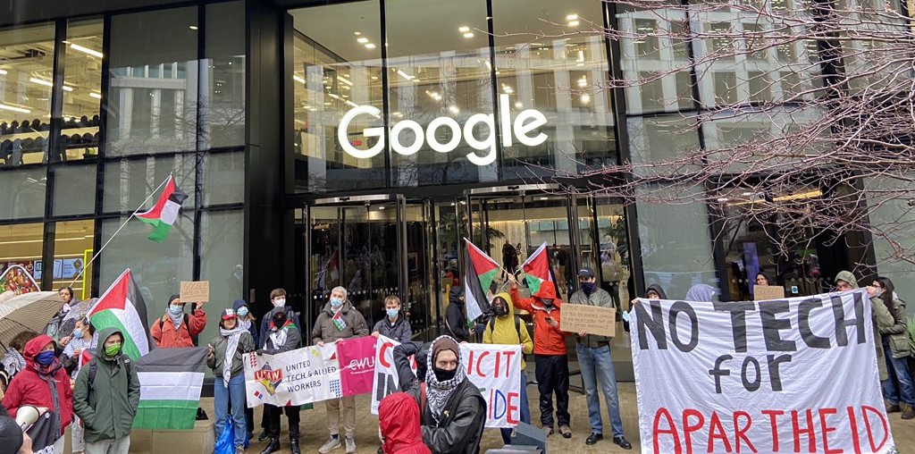 Protest at Google’s London HQ in Pancras Square, demanding Google ends its Project Nimbus contract with Israel to provide cloud computing services, used for surveillance and oppression of Palestinians. No tech for apartheid! @NoTechApartheid @Workers4Pal🇵🇸 pic.twitter.com/TbNzgMC7vk