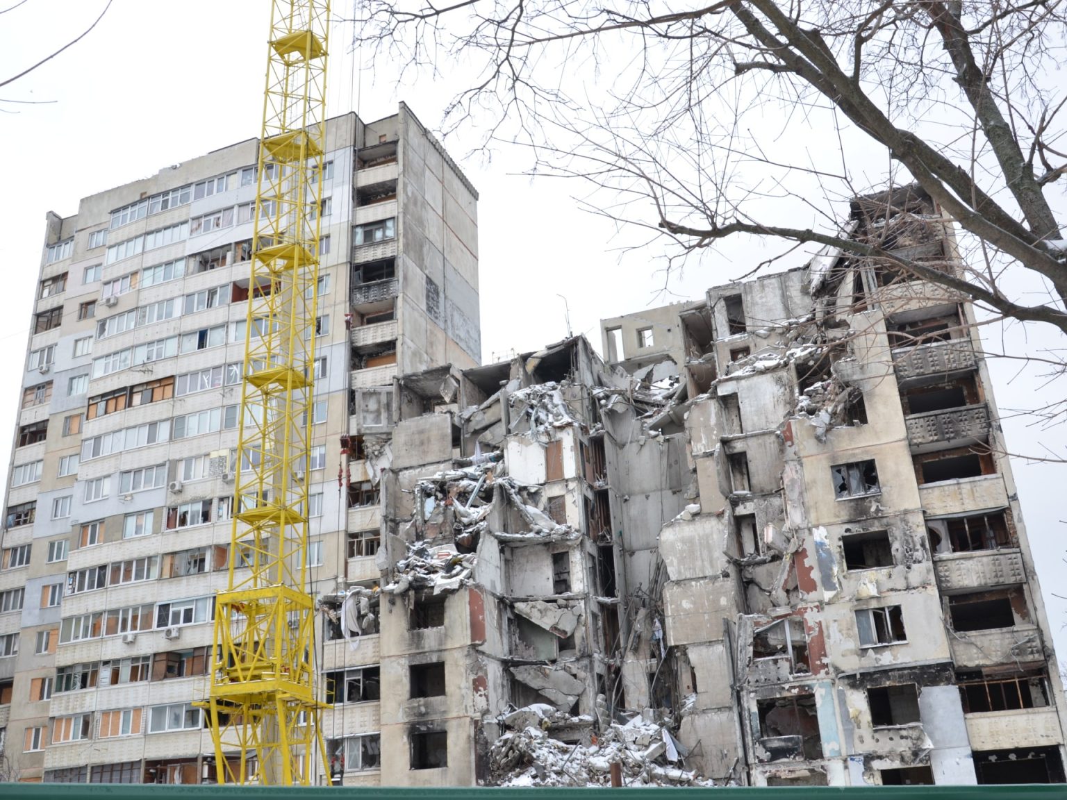 دمار لحق بأحد المباني السكنية في حي سالتوفكا شمال شرق مدينة خاركيف (الجزيرة)
