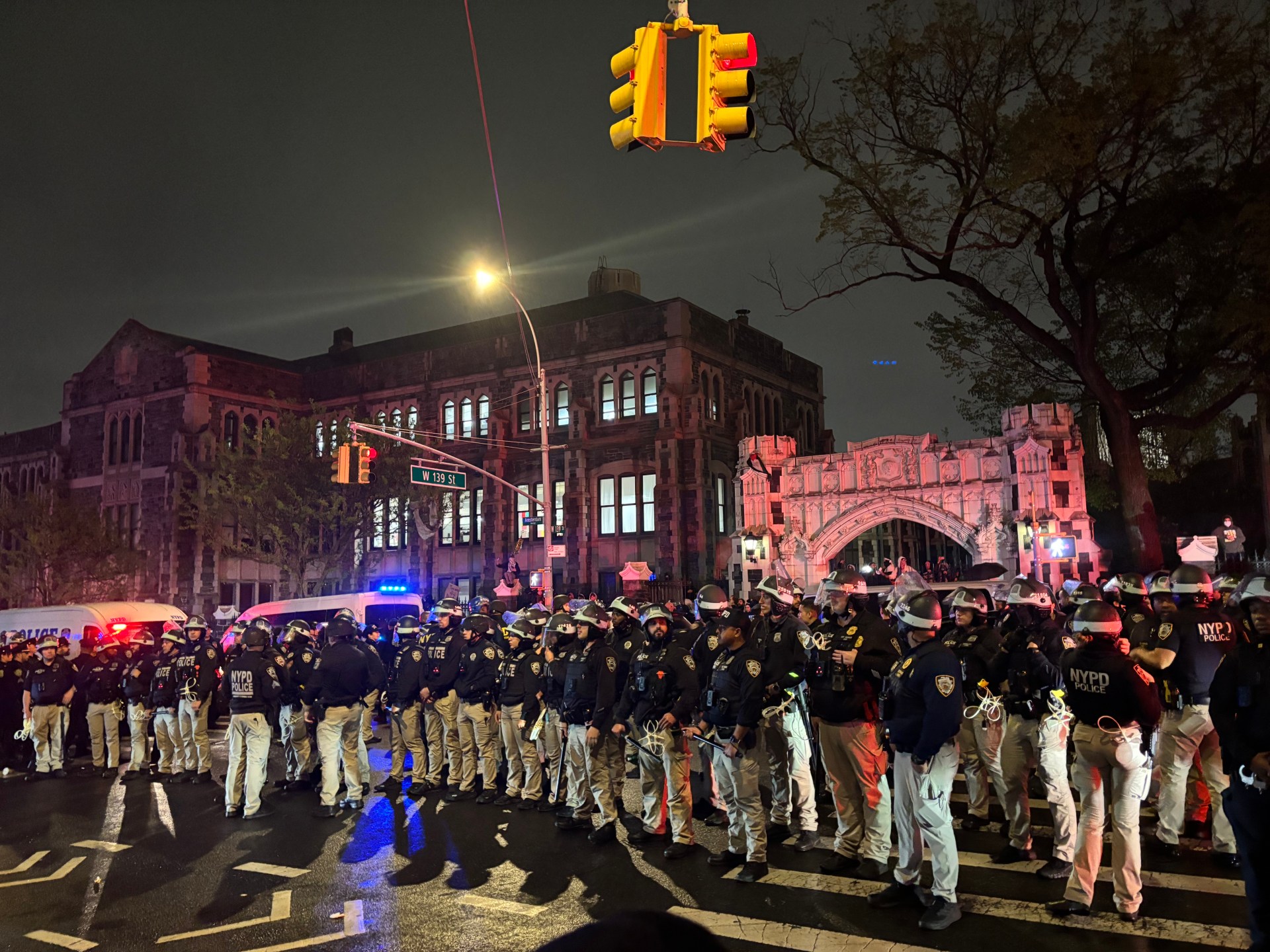 في الساعة الثامنة مساء، وعبر مكبر الصوت، حذرت شرطة نيويورك الموجودين داخل مبنى كلية نيويورك “إذا خرجتم فلن يتم اتهامكم بأي شيء، أما إذا بقيتكم، فسيتم اعتقالكم”. في حين احتشد المتظاهرون خارج الجامعة في محاولة لمنع الشرطة من الدخول.