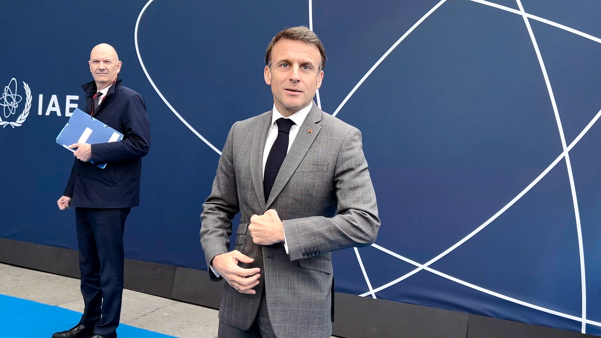 وقد تأخر ماكرون في الوصول للإدلاء بتصريحاته الصحفية بسبب إخلاء منطقة الصحافة “لأسباب أمنية”، بما في ذلك الصحفيون، بعد أن قام أحد نشطاء منظمة “السلام الأخضر” برفع لافتة كُتب عليها “حكاية نووية خيالية” فوق المبنى الذي يستضيف قادة وممثلي حوالي 40 دولة.