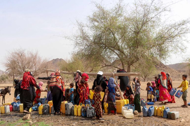 نازحون يمنيون ينتظرون لتعبئة الماء في مخيم مؤقت (الفرنسية)