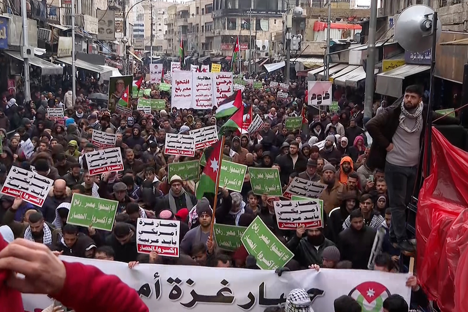 كما طالب متظاهرون أردنيون بكسر الحصار المفروض على قطاع غزة، وذلك خلال مسيرة انطلقت من أمام المسجد الحسيني وسط العاصمة عمان تحت عنوان “حصار غزة أميركي بأيدٍ عربية”.