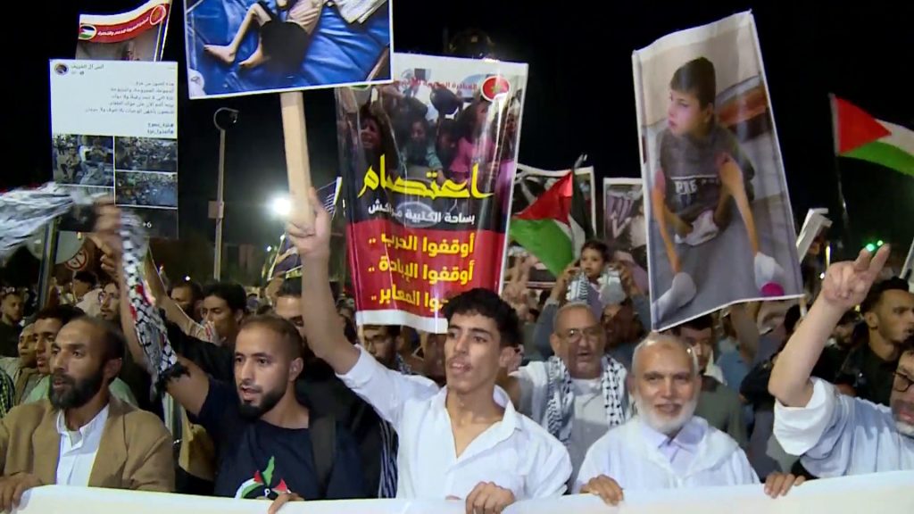 وشهدت مدن مغربية عدة، من ضمنها العاصمة الرباط والدار البيضاء (غرب) وسيدي قاسم وطنجة وتطوان (شمال) وتازة ووجدة وبركان (شرق)، مظاهرات رفع فيها المشاركون لافتات مساندة للفلسطينيين ومطالبة بوقف التجويع والإبادة في القطاع.
