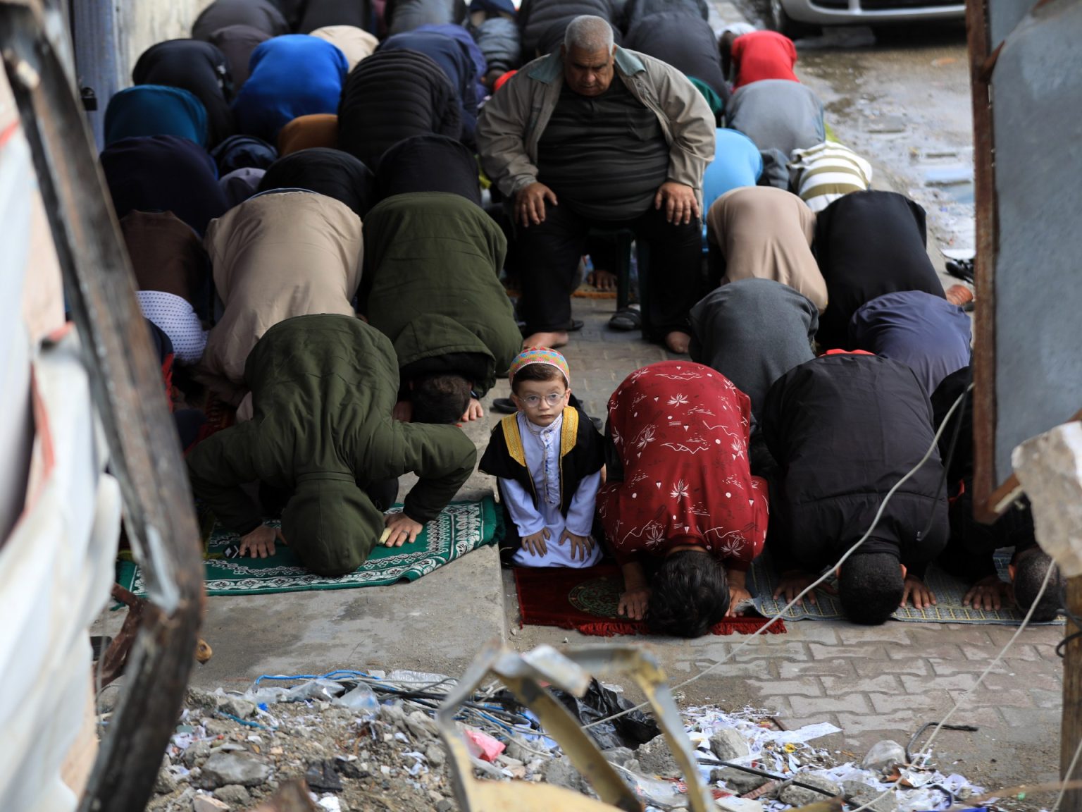 ونشر ناشطون من غزة مقاطع فيديو تظهر أهالي مخيم جباليا شمالي القطاع وهم يقيمون صلاة العيد في العراء وتحت الأمطار.