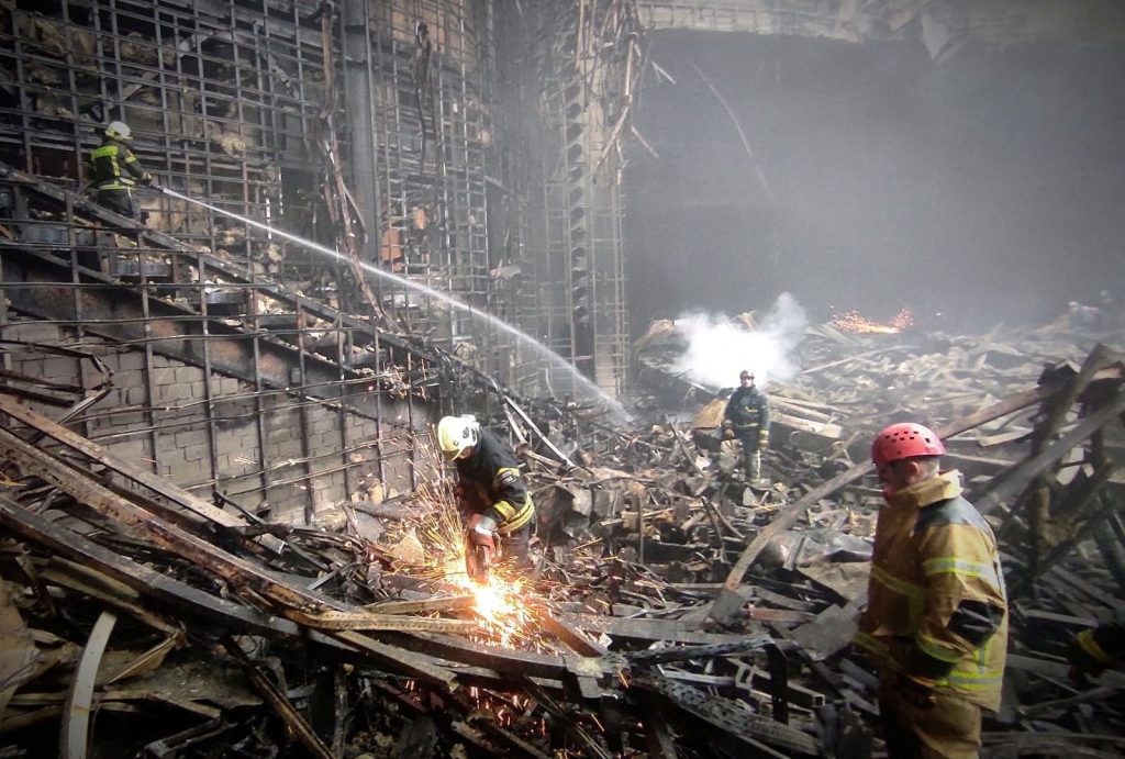 وأظهرت مشاهد متداولة على مواقع التواصل أن المهاجمين فتحوا النار بشكل عشوائي في القاعة، كما اندلع حريق في سقف المبنى أدى إلى انهياره لاحقا.