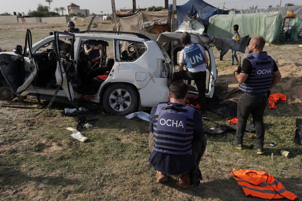 موظفو الأمم المتحدة يتفقدون هيكل السيارة التي تستخدمها منظمة الإغاثة العالمية “وورلد سنترال كيتشن” ومقرها الولايات المتحدة، والتي تعرضت لضربة إسرائيلية في اليوم السابق في دير البلح بوسط قطاع غزة في 2 أبريل.