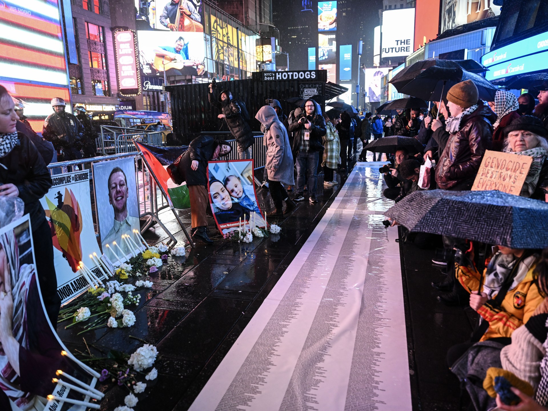 كما بسطوا على الطريق لوحة كبيرة ملفوفة تضم أسماء المدنيين الفلسطينيين الذين استشهدوا بنيران الاحتلال الإسرائيلي في غزة.