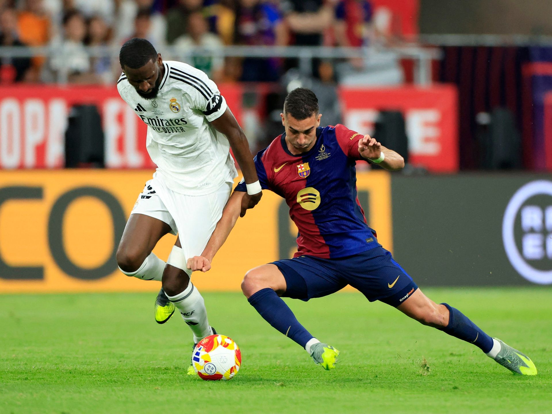 أُوقِف الألماني أنتونيو روديغر مدافع ريال مدريد الإسباني لكرة القدم -اليوم الأربعاء- 6 مباريات بعدما طُرد من نهائي كأس إسبانيا أمام برشلونة بسبب رميه مقذوفا باتجاه الحكم.