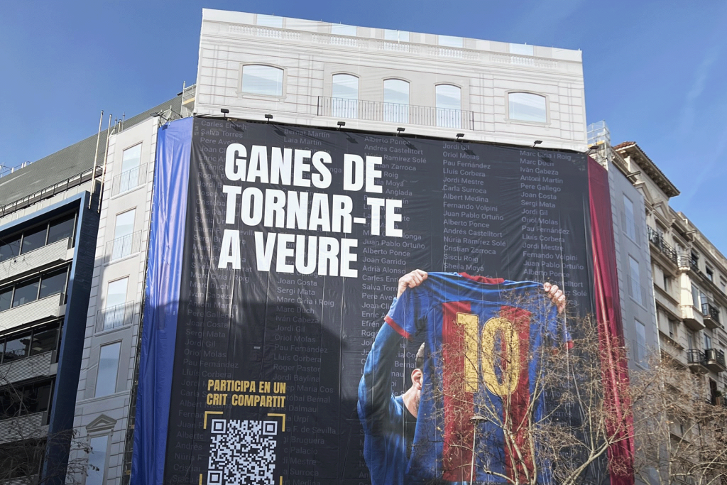 عرض سيريا ملصقًا إعلانيًا ضخمًا في مدينة برشلونة يظهر فيه ميسي وهو يرفع قميصه الشهير رقم 10، مع عبارة “يسعدنا أن نراك مجددًا”، مستعيدًا شعارًا استخدمه الرئيس الحالي خوان لابورتا في حملته السابقة. يُعتبر لابورتا حاليًا هو المرشح الأوفر حظًا للحفاظ على منصبه.