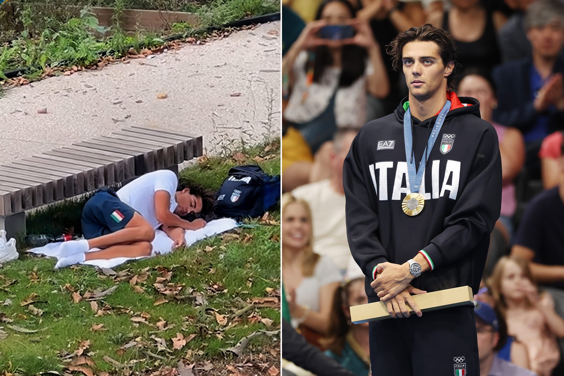 شوهد الإيطالي توماس سيكون -الحائز على الميدالية الذهبية في السباحة- وهو ينام في حديقة باريس بعد أن اشتكى من الظروف الصعبة بالقرية الأولمبية في باريس.