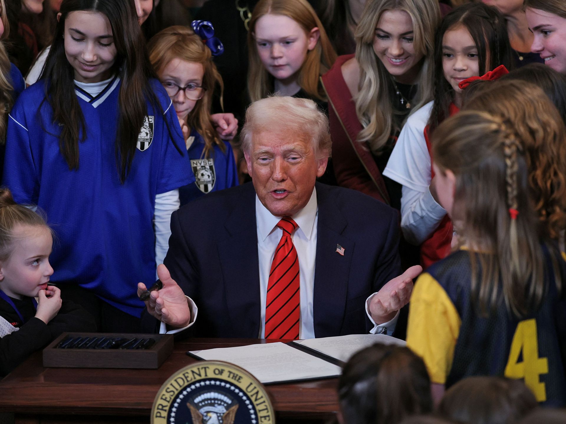 وقال ترامب قبل توقيعه على القرار في البيت الأبيض وقد تحلقت حوله عشرات الفتيات الصغيرات “من الآن فصاعدا ستكون الرياضات النسائية للنساء فقط”، مضيفا “بهذا الأمر التنفيذي تنتهي الحرب على الرياضات النسائية”.
