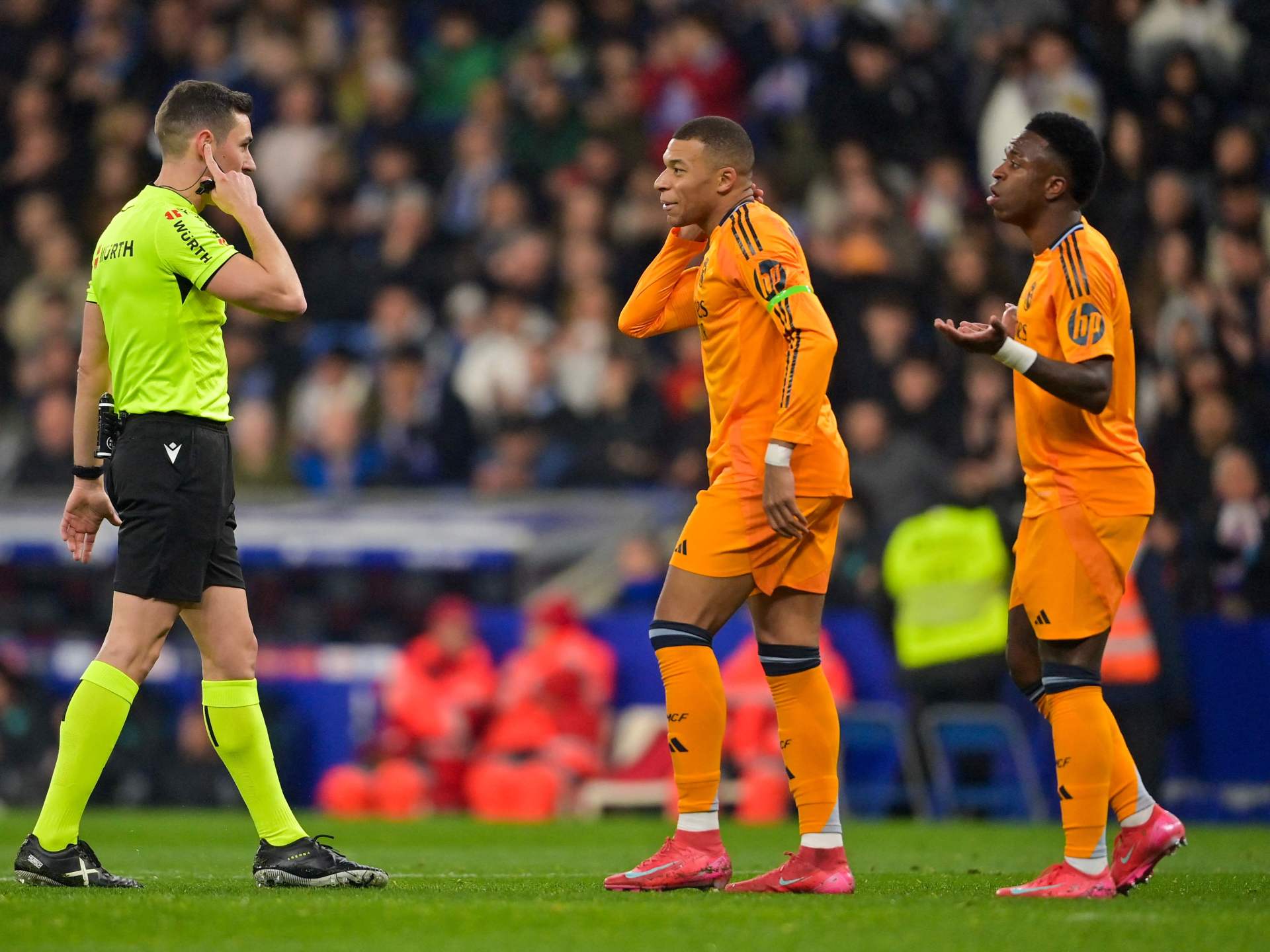 وشعر لاعبو “لوس بلانكوس” بالغضب من أداء التحكيم خلال خسارتهم 1-0 أمام إسبانيول في الجولة الـ22 من الليغا، إذ ألغى الحكم هدف فينيسيوس جونيور في الشوط الأول بسبب خطأ من كيليان مبابي على مدافع إسبانيول.