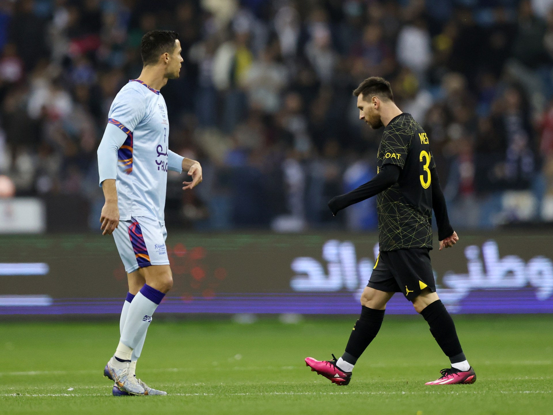 وكان آخر لقاء بين ميسي ورونالدو كان لقاءً وديا بين باريس سان جيرمان والنصر السعودي في يناير/كانون الثاني 2023.