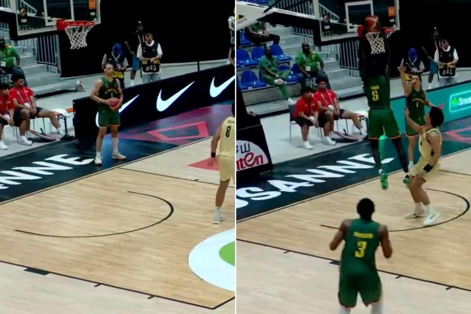 Amadou Seini dunks at his own basket, late in the 4th quarter, with less than 50 seconds remaining in regulation, while his team is up 6 points