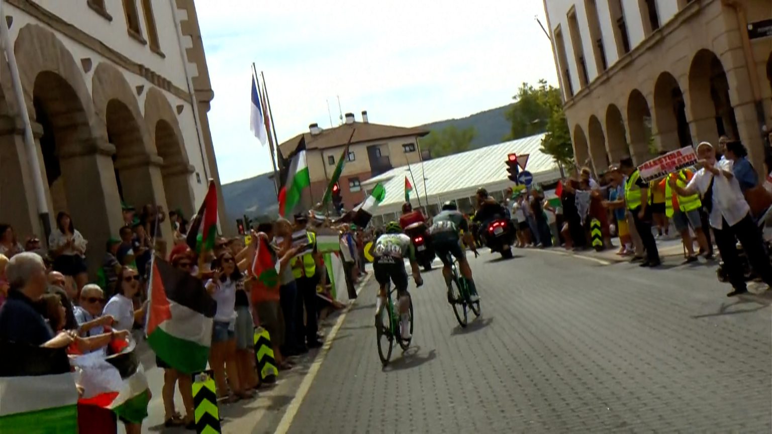 وتجمع العديد من المتظاهرين المؤيدين للفلسطينيين خلال أول عبور لكوكبة السباق لخط النهاية، وكان بعضهم يحاول اختراق الحواجز على طول الخط المستقيم الأخير، محاطين برجال الشرطة.