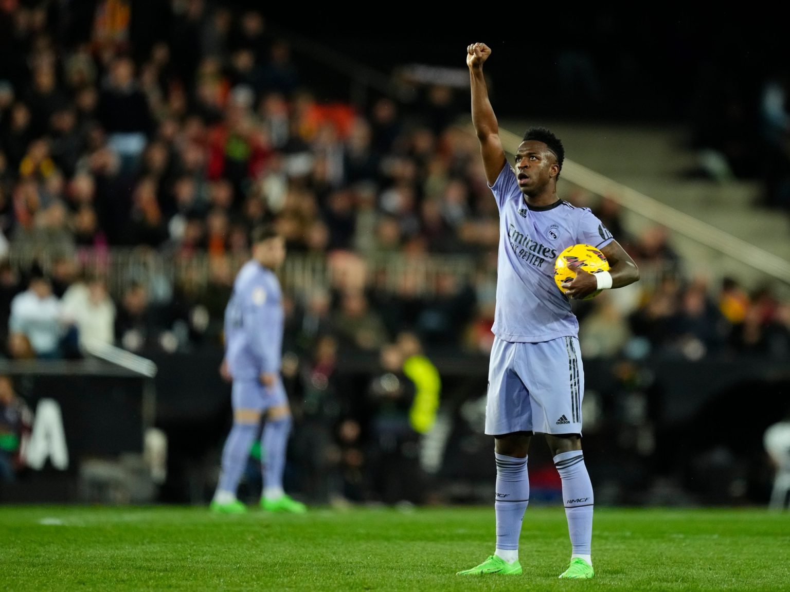 ورفع فينيسيوس قبضته في تحية “القوة السوداء” (شعار داعم لذوي البشرة السمراء) بعد هدفه الأول في الملعب ذاته الذي تعرض فيه لإساءات عنصرية الموسم الماضي، في حادثة دفعت بفالنسيا إلى منع 3 من مشجعيه من دخول الملعب مدى الحياة.