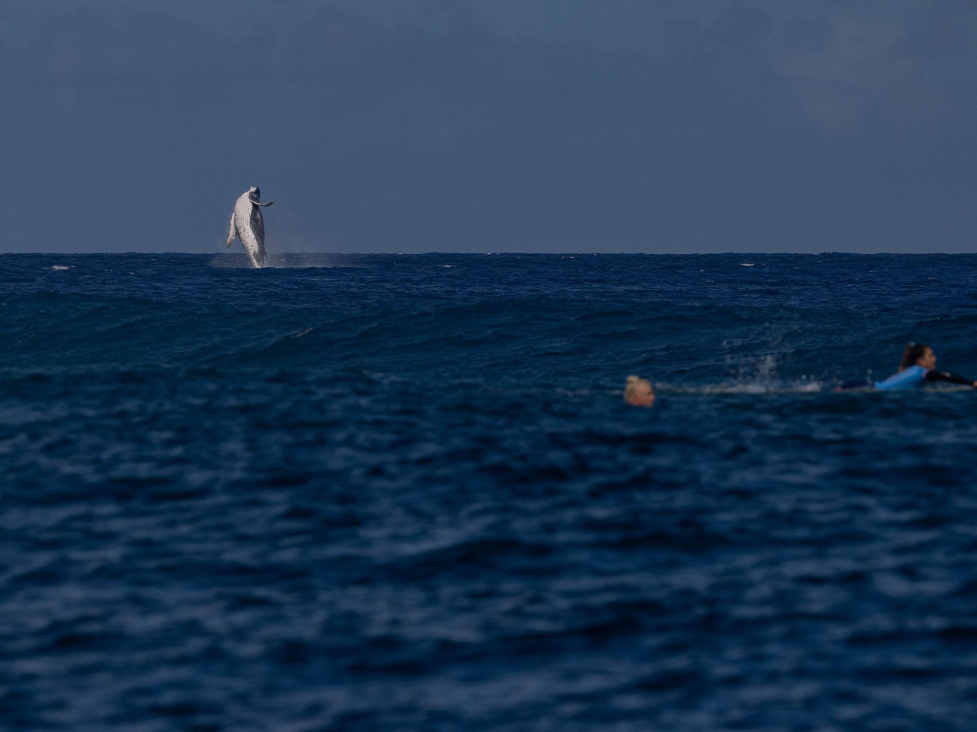 Whale of a time.@AFP photographer Jerome Brouillet captures a whale breaching as Brazil’s Tatiana Weston-Webb and Costa Rica’s Brisa Hennessy compete in the women’s surfing semi-finals, during the 2024 #Olympics , in Teahupo’o, on the French Polynesian Island of Tahiti pic.twitter.com/OrUTScyOFe