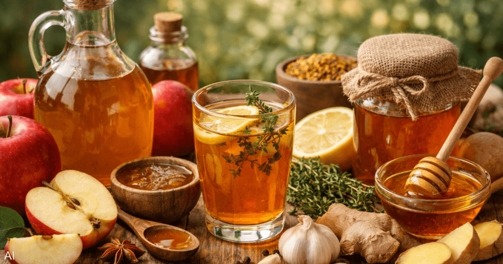 يحتوي كل من خل التفاح والعسل على مركبات مضادة للأكسدة وخصائص مضادة للميكروبات، قد تساعد في تعزيز المناعة وتقليل قابلية الإصابة بنزلات البرد والإنفلونزا. كما أن خصائصهما المضادة للالتهاب قد تخفف التهاب الحلق والسعال وتساعد على تسييل المخاط.