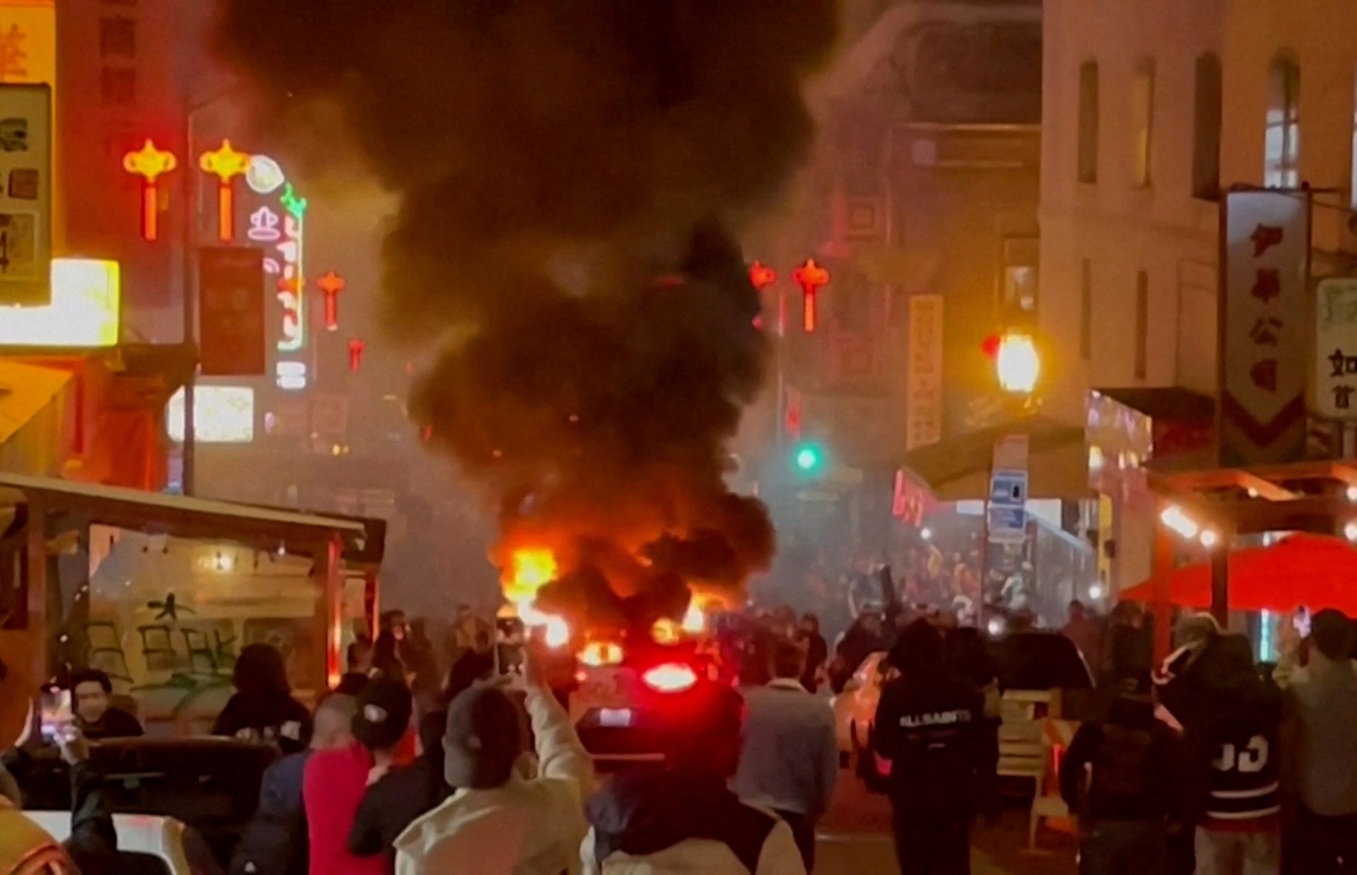 وبدأت الحادثة عندما قررت سيارة الأجرة ذاتية القيادة من نوع وايموالتوجه نحو تقاطع شارعين مكتظين مساء السبت، عندما كانت الحشود تسد جميع الجوانب وكان المحتفلون يضيئون الألعاب النارية، وفقا لشاهدين. وبعد دقائق، هاجم بعض المتجمهرين السيارة وأضرموا فيها النار.